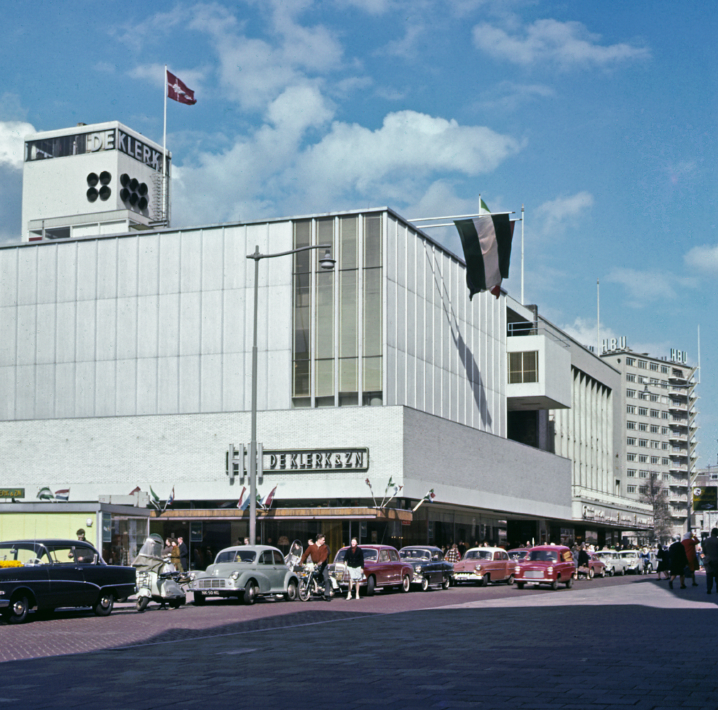 Home furnishing company De Klerk lost its Rotterdam stores in WWII and on the corner of Binnenwegplein, had a new building built by Van de Broek and Bakema. It became a modern cube....